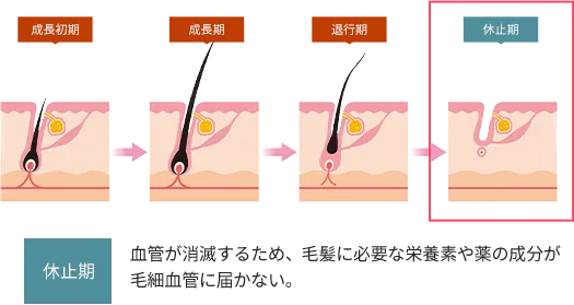 通常、発毛を促す内服薬(フィナステリドやミノキシジルなど)は、血流を介して毛乳頭に栄養や有効成分を届けることで作用します。ところが、休止期に入った毛根では毛母細胞が活動を止め、毛乳頭につながる毛細血管も消失してしまうため、薬の効果が十分に届きにくくなってしまうのです。