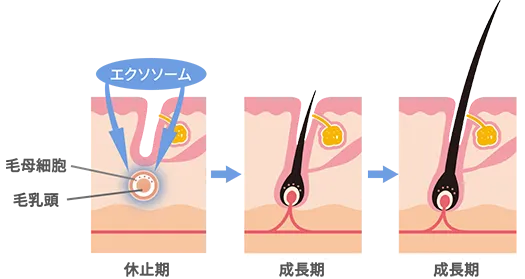 毛髪再生では、エクソソームが毛包細胞に働きかけて休止期の細胞を活性化し、DHT(ジヒドロテストステロン)の抑制や抗炎症、抗老化、組織修復といった多面的な作用によって、発毛を促進し健やかな頭皮環境を整えることが期待されています。