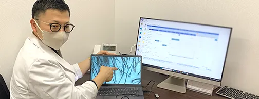 薄毛治療を成功させるためには、正しい診断から始めることが大切です。当院では毛髪診断士と専門医師がマイクロスコープを使用し、頭皮や髪の状態を細かくチェックします。その結果を患者さまと一緒に確認しながら、現状の状態や今後のケア計画について丁寧にご説明いたします。治療前の状態を正しく把握するのはもちろん、治療中も定期的に経過を観察、効果を確認しながら安心して治療を続けていただけます。