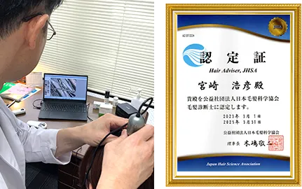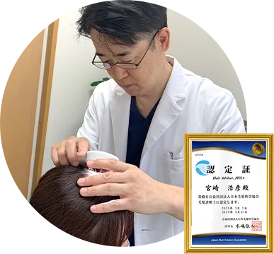 当院では、毛髪診断士資格を持つスタッフと、同資格を保有する院長があなたの髪と頭皮の状態を丁寧に診断。